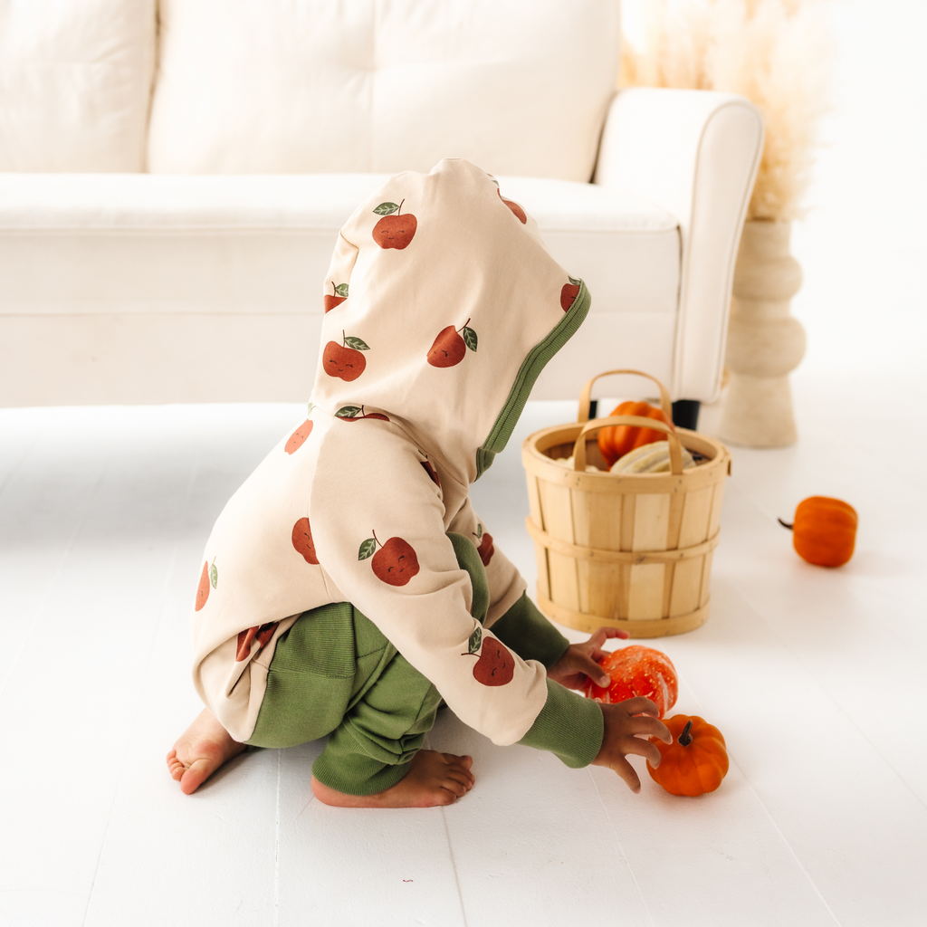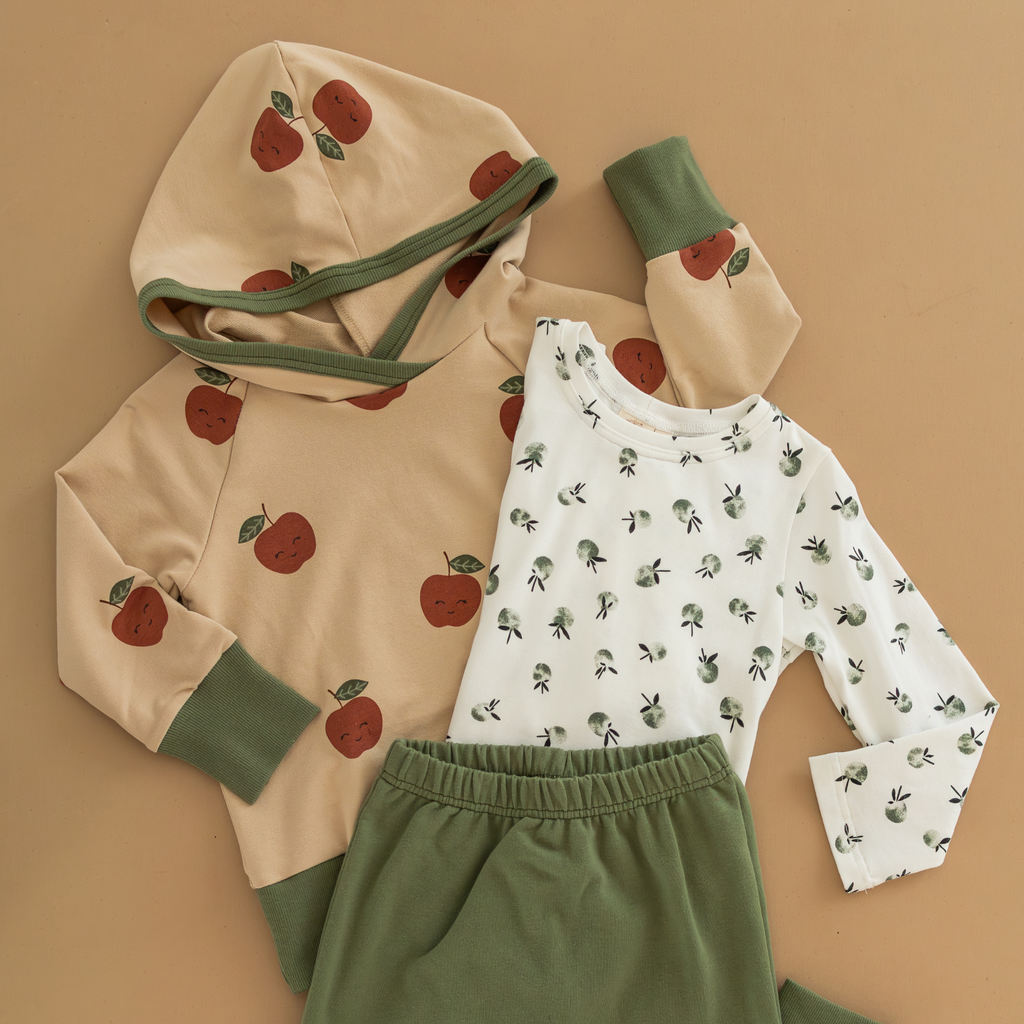 The Happy Apple print brings a cheerful pop of color with its sweet apple illustrations on a creamy base, trimmed with olive green cuffs and hood lining for a perfectly autumnal look. Designed with a roomy fit for layering and a cross-over hood that keeps little heads extra cozy, it’s the hoodie your kids will want to wear every day.