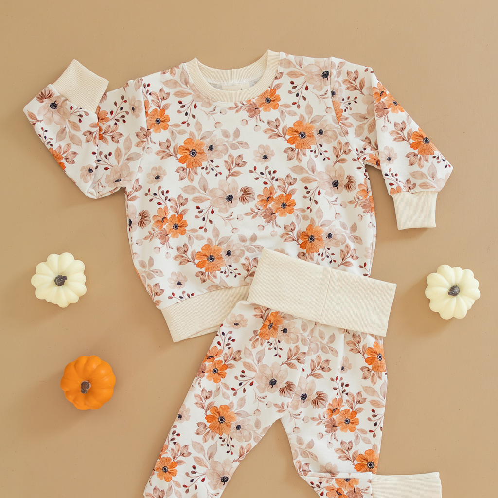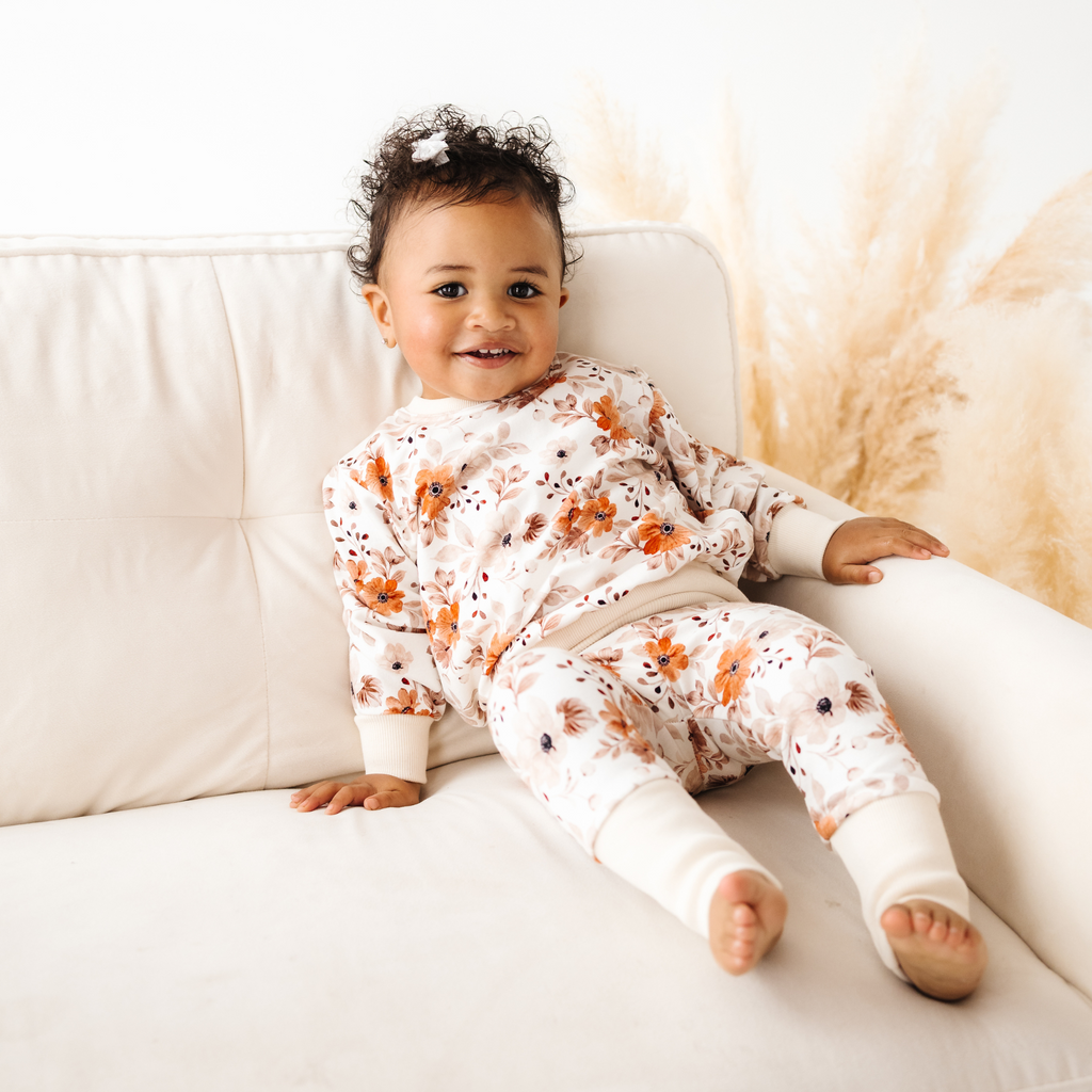 Featuring a timeless fall floral print in warm rust, cream, and soft neutrals, the Verbena is perfect for mixing and matching with our Dogwood or Reed pants. The relaxed fit allows for easy layering over tees and onesies, while the stretchy ribbed cuffs and waistband keep it snug and secure.