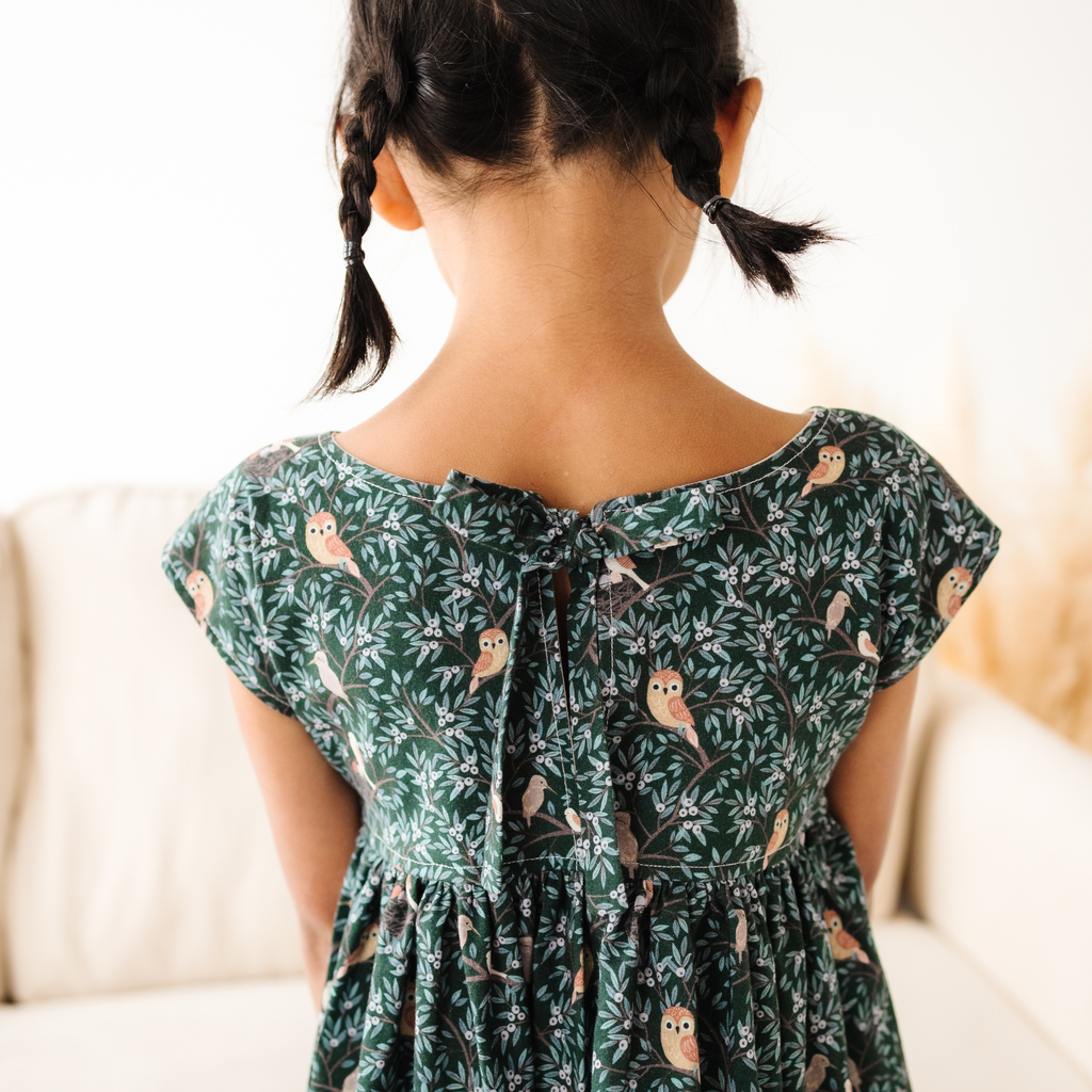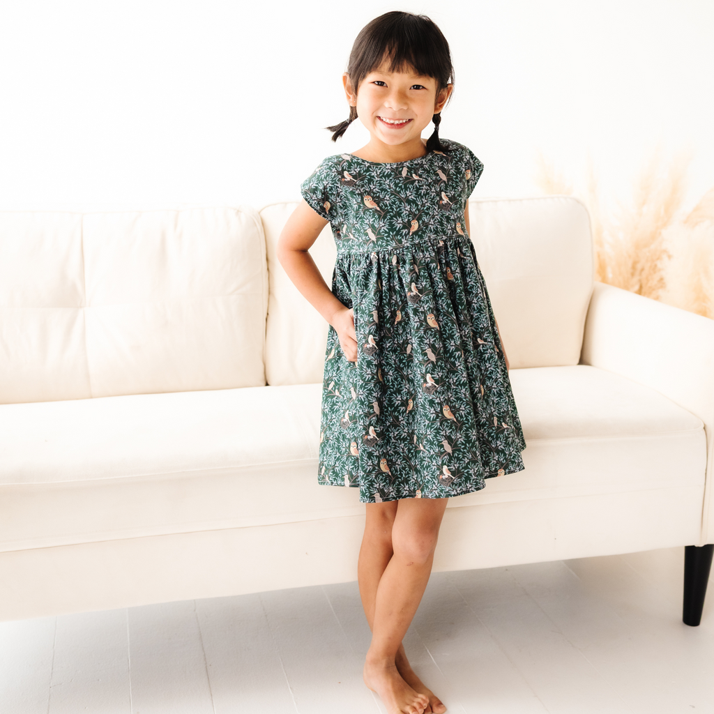 Featuring our Bird Nest print, this dress brings the beauty of the forest to your little one’s wardrobe, complete with perched owls, leafy branches, and sweet woodland details. The classic gathered waist and cap sleeves make this dress extra comfy.